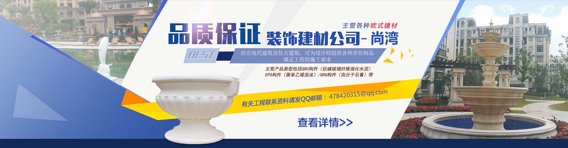 上海尚灣建材有限公司是一家集室內外設計、生產、制作、安裝、GRG構件、GRC歐式構件、EPS構件、浮雕、雕塑、假山、假樹、砂巖工藝品、玻璃鋼工藝品的專業生產廠家。根據甲方提供的設計圖紙,按圖紙加工各種材料的GRC歐式構件,EPS線條、室內外砂巖、玻璃鋼浮雕及圓雕、藝術圍欄、現場安裝施工、真石漆、乳膠漆噴涂等圍繞整個建筑裝飾工程的全方位施工,并且結合現代建筑及仿古建筑,可為設計師提供各種異形制品,滿足工程的施工要求。